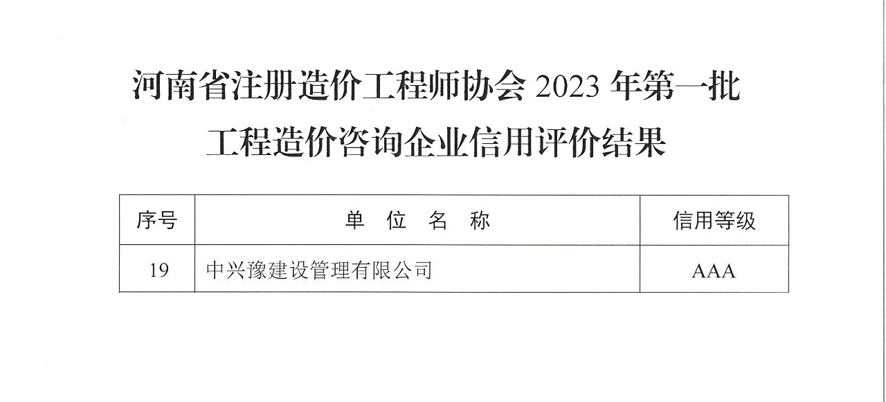 近日,河南省注冊造價工程師協(xié)會公布了《2023年第一批工程造價咨詢企業(yè)信用評價結(jié)果的通知》,經(jīng)單位申報、專家組評審、公示等程序,中興豫建設(shè)管理有限公司榮獲2023年工程造價咨詢企業(yè)信用等級AAA級企業(yè)!
