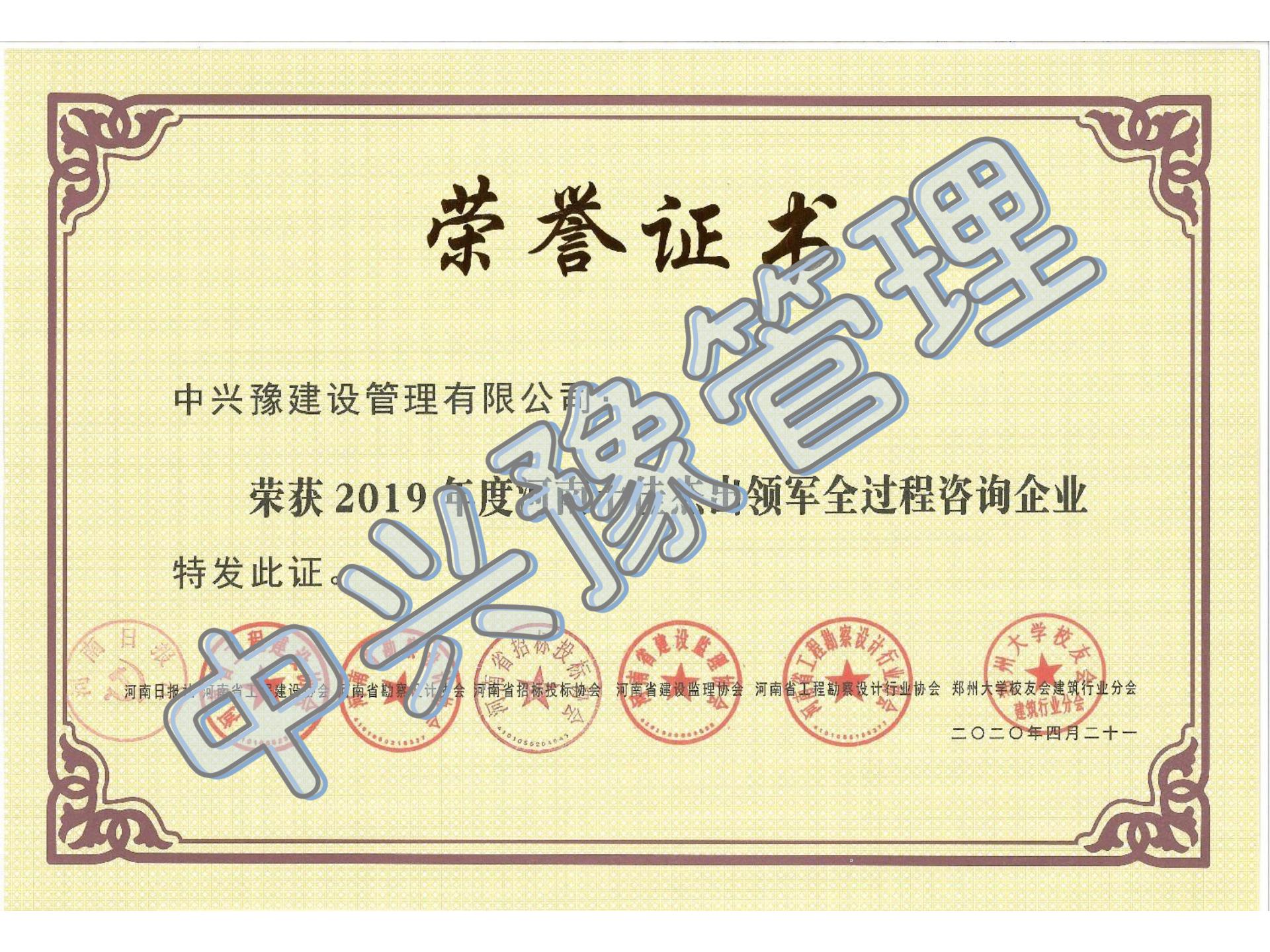 2019年度河南十佳杰出領(lǐng)軍全過程咨詢企業(yè)-公司榮譽(yù)