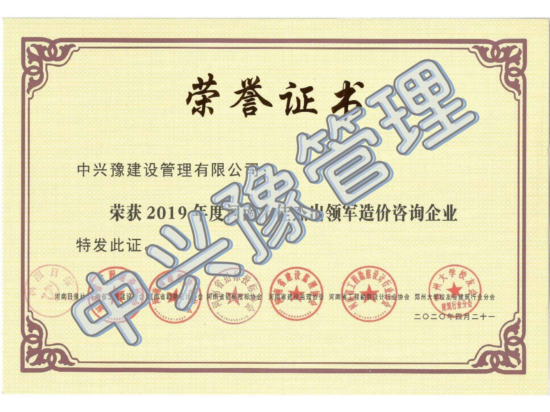 2019年度河南十佳杰出領(lǐng)軍造價咨詢企業(yè)-公司榮譽