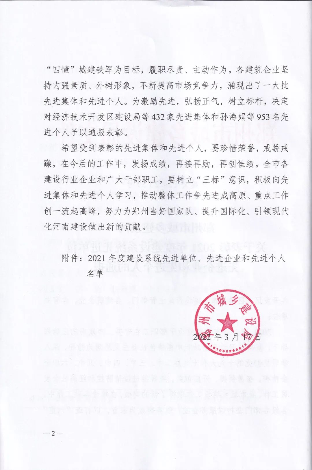 近日,鄭州市城鄉(xiāng)建設(shè)局發(fā)布了《關(guān)于表彰2021年度建設(shè)系統(tǒng)先進(jìn)單位先進(jìn)企業(yè)和先進(jìn)個(gè)人的通報(bào)》,中興豫建設(shè)管理有限公司被評(píng)為“2021年度招標(biāo)代理先進(jìn)單位”、“2021年度造價(jià)咨詢行業(yè)先進(jìn)單位”,我公司員工韋曉東被評(píng)為“優(yōu)秀總監(jiān)”、劉東生被評(píng)為“優(yōu)秀注冊(cè)監(jiān)理工程師”、賈世軍被評(píng)為“優(yōu)秀造價(jià)工程師”。