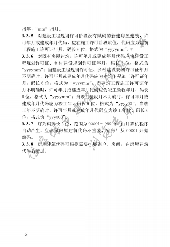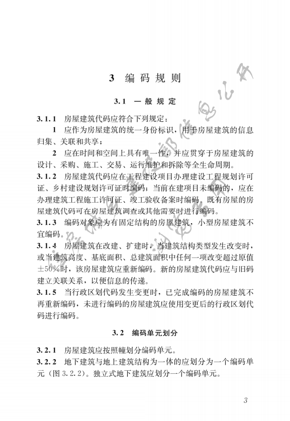 《標(biāo)準(zhǔn)》明確,房屋建筑代碼應(yīng)作為房屋建筑的統(tǒng)一身份標(biāo)識(shí),用于房屋建筑的信息歸集、關(guān)聯(lián)和共享;應(yīng)在時(shí)間和空間上具有惟一性,并應(yīng)貫穿于房屋建筑的設(shè)計(jì)、采購、施工、交易、運(yùn)行維護(hù)和拆除等生命周期。房屋建筑代碼應(yīng)在工程建設(shè)項(xiàng)目辦理建設(shè)工程規(guī)劃許可證、鄉(xiāng)村建設(shè)規(guī)劃許可證時(shí)編碼;當(dāng)前在建項(xiàng)目未編碼的,應(yīng)在辦理建筑工程施工許可證、竣工驗(yàn)收備案時(shí)編碼。既有房屋的房屋建筑代碼可在房屋建筑調(diào)查或其他需要時(shí)進(jìn)行編碼。編碼對(duì)象應(yīng)為有固定結(jié)構(gòu)的房屋建筑,小型房屋建筑不宜編碼。房屋建筑在改建、擴(kuò)建時(shí),當(dāng)建筑結(jié)構(gòu)類型發(fā)生改變時(shí),或當(dāng)建筑高度、基底面積、總建筑面積中任何一項(xiàng)改變超過±50%時(shí),該房屋建筑應(yīng)重新編碼。新的代碼應(yīng)與舊碼建立關(guān)聯(lián)關(guān)系,以便信息的傳遞。當(dāng)行政區(qū)劃代碼發(fā)生變更時(shí),已完成編碼的房屋建筑不再重新編碼,未進(jìn)行編碼的應(yīng)使用變更后的行政區(qū)劃代碼進(jìn)行編碼。