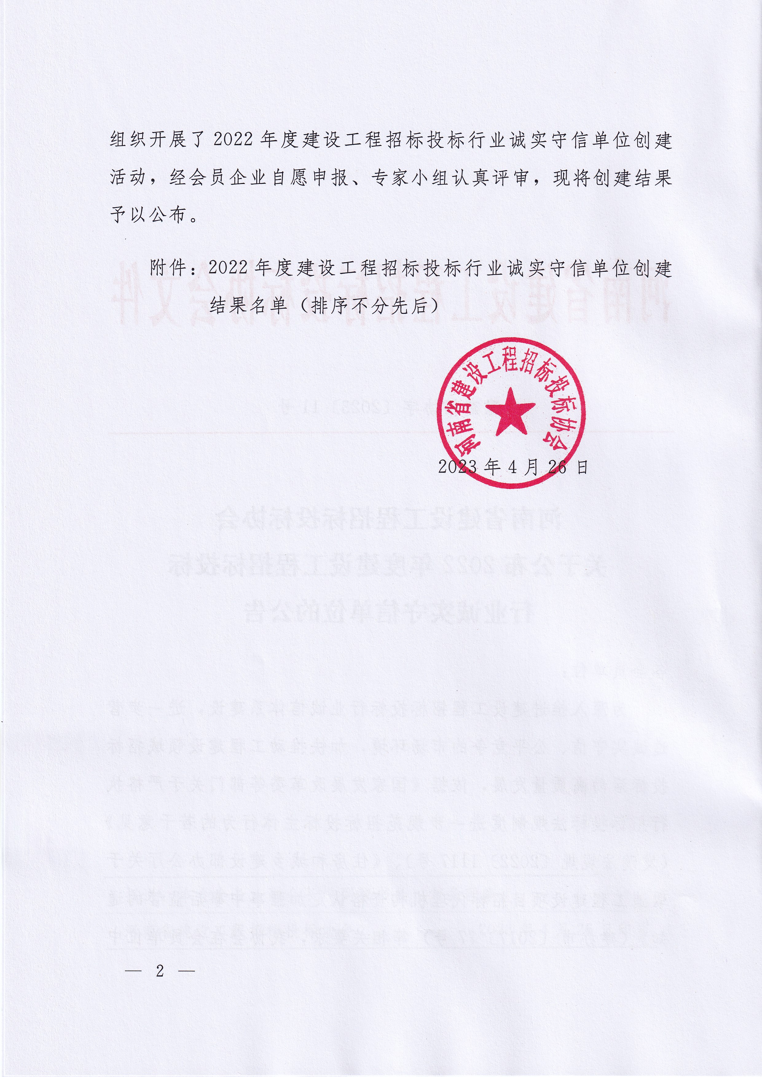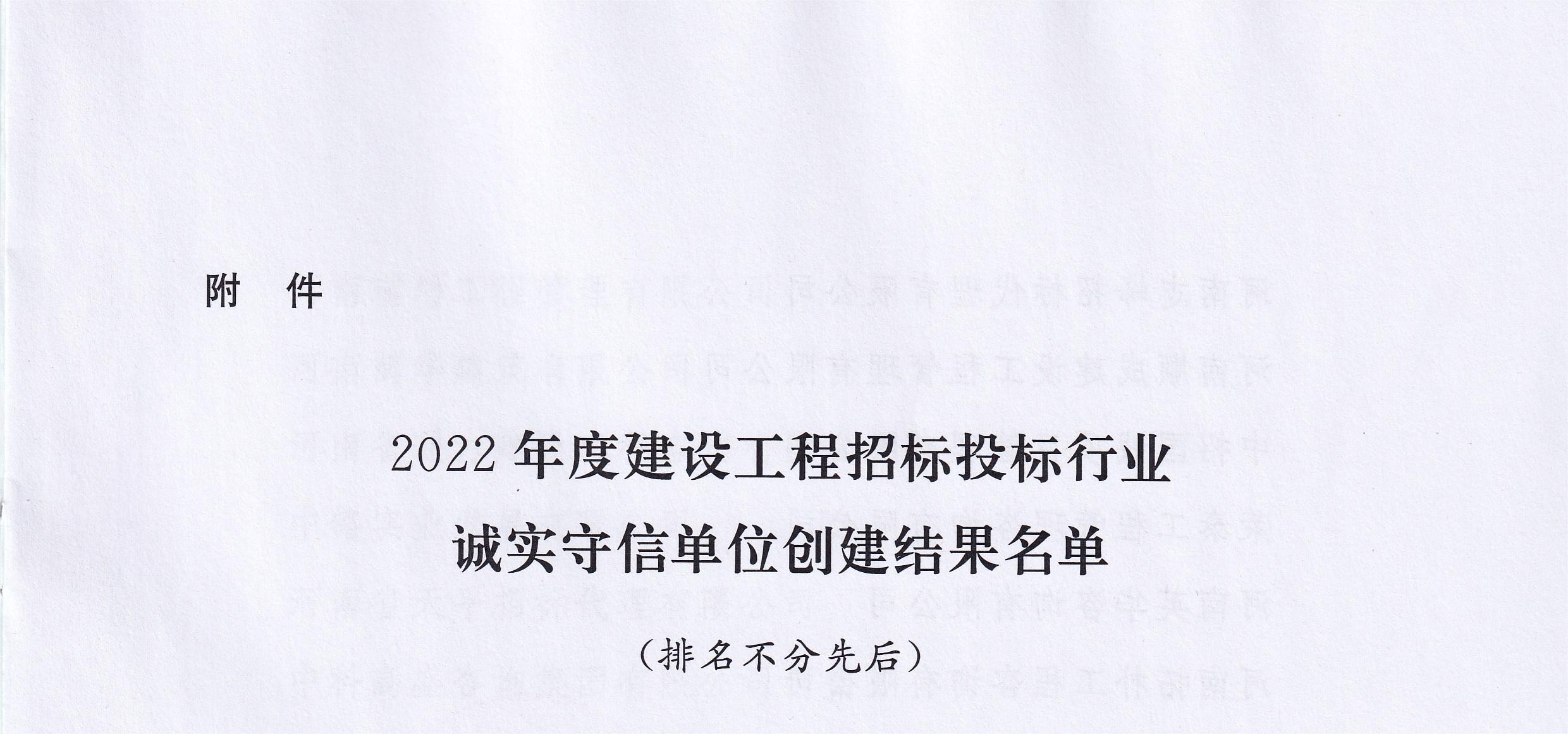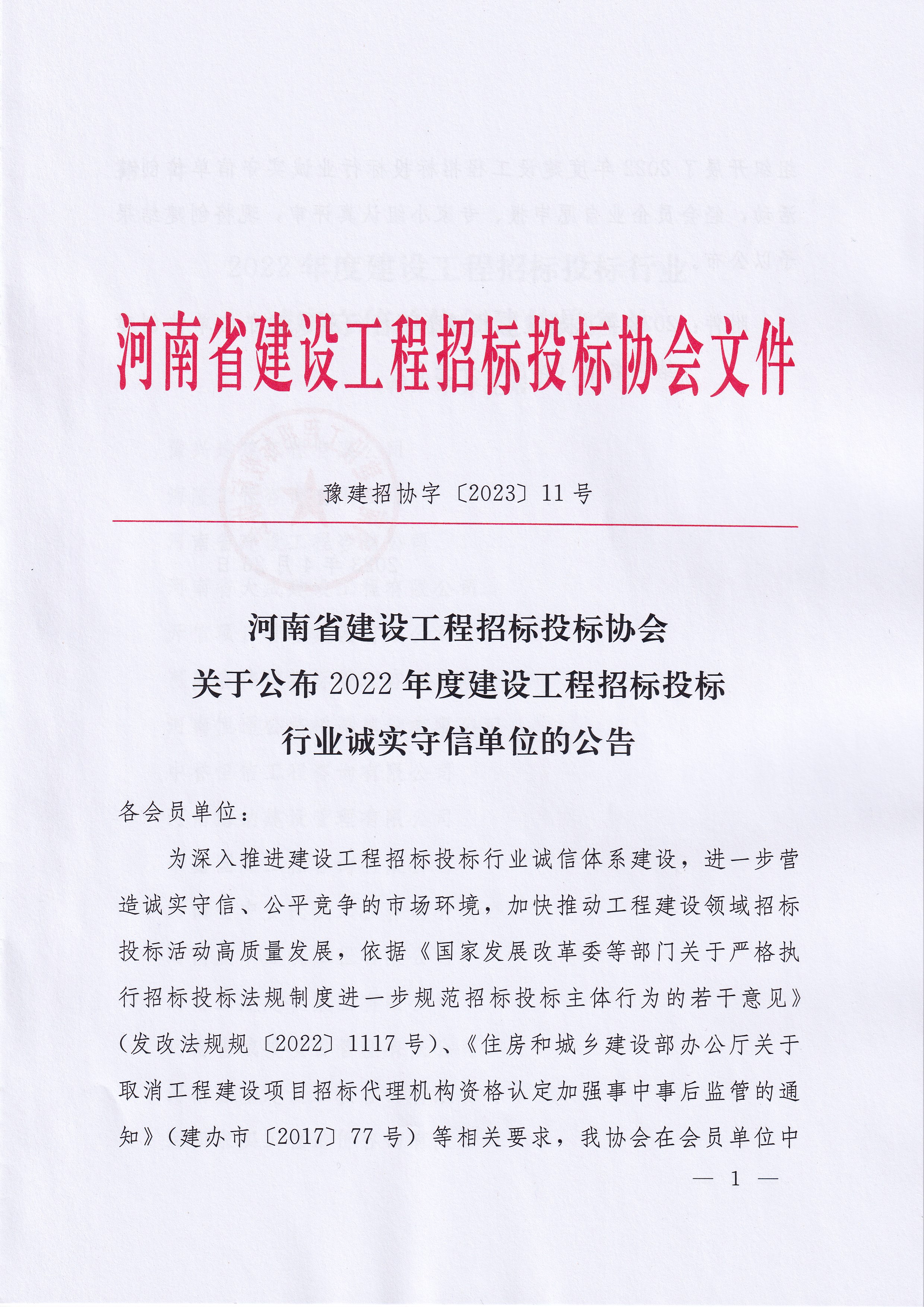 近日,河南省建設(shè)工程招標(biāo)投標(biāo)協(xié)會(huì)發(fā)布了《河南省建設(shè)工程招標(biāo)投標(biāo)協(xié)會(huì)關(guān)于公布2022年度建設(shè)工程招標(biāo)投標(biāo)行業(yè)誠實(shí)守信單位的公告》,中興豫建設(shè)管理有限公司被評為“2022年度河南省建設(shè)工程招標(biāo)投標(biāo)行業(yè)誠實(shí)守信單位”。