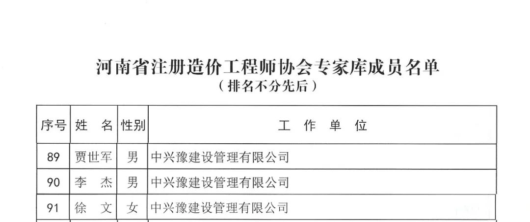 6月12日,河南省注冊造價(jià)工程師協(xié)會(huì)公布了“河南省注冊造價(jià)工程師協(xié)會(huì)專家?guī)斐蓡T名單”的通知,我公司賈世軍、李杰、徐文3名注冊造價(jià)師順利入圍專家?guī)?/span>。