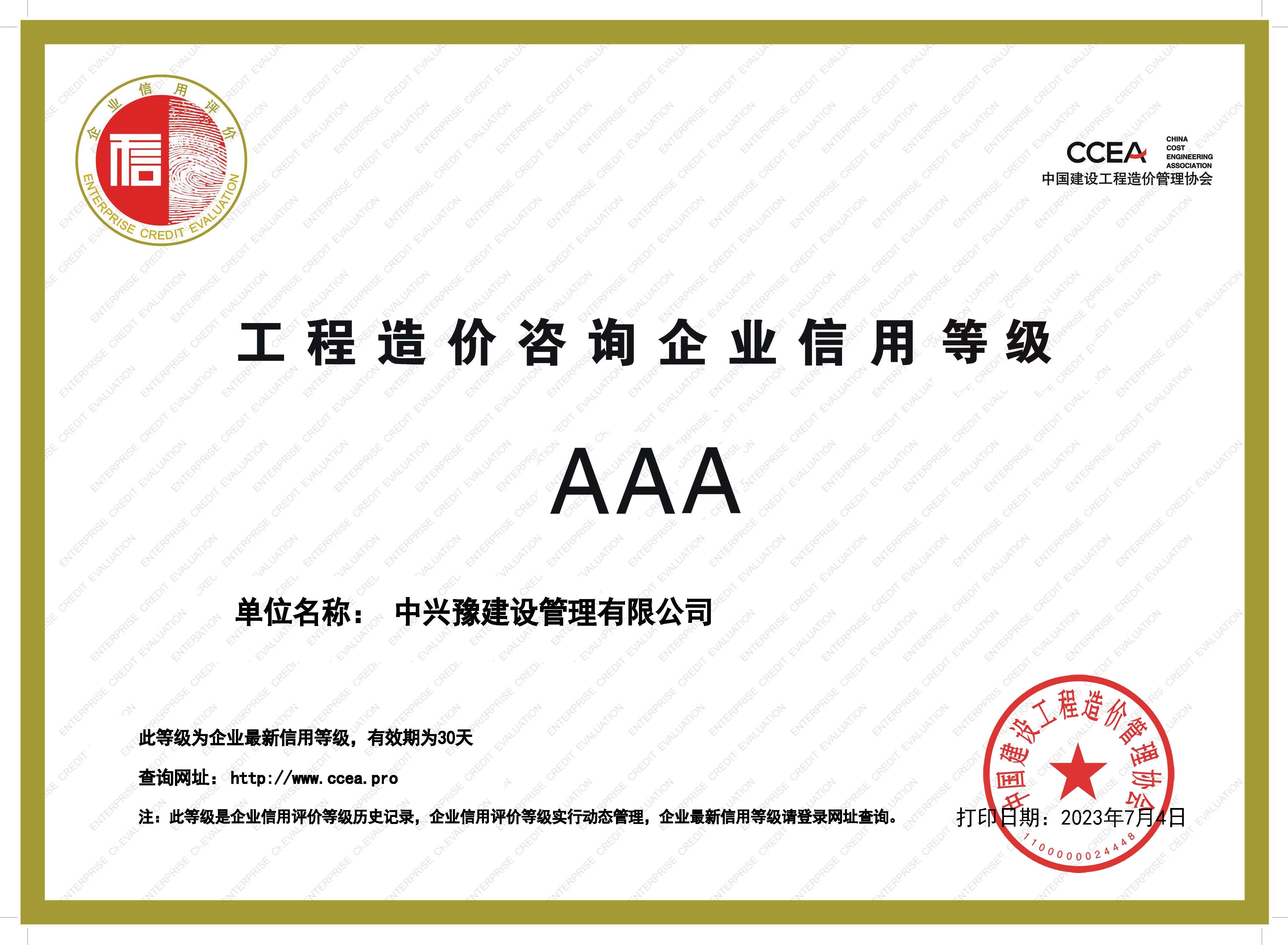7月4日,中國建設(shè)工程造價管理協(xié)會發(fā)布關(guān)于公布2023年第一批工程造價咨詢企業(yè)信用評價結(jié)果的通知,經(jīng)企業(yè)申報、各省級工程造價行業(yè)協(xié)會初評,中價協(xié)組織專家終評等程序,中興豫建設(shè)管理有限公司榮獲中國建設(shè)工程造價管理協(xié)會信用評價AAA級!