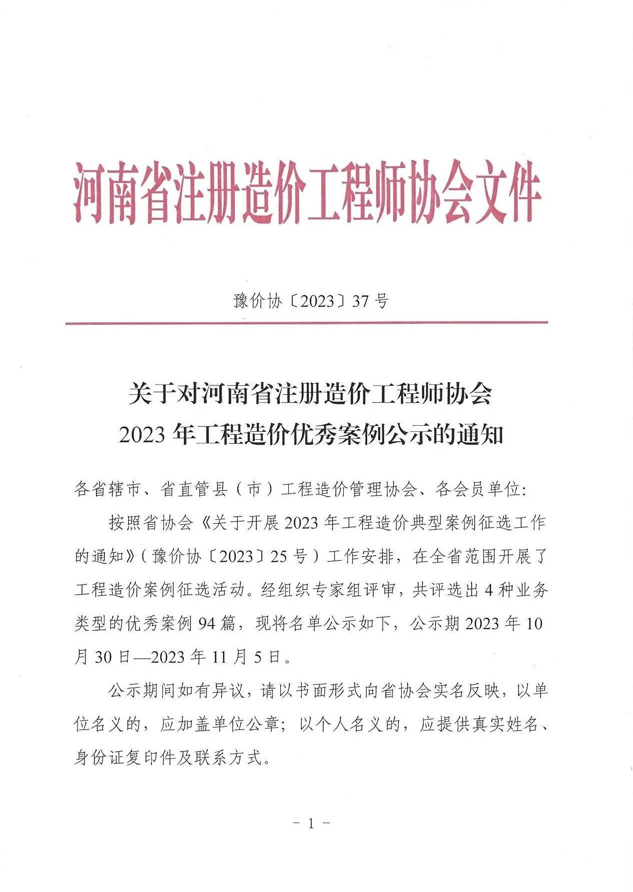 10月30日,10月30日,河南省注冊(cè)造價(jià)工程師協(xié)會(huì)公布了“河南省注冊(cè)造價(jià)工程師協(xié)會(huì)2023年工程造價(jià)優(yōu)秀案例公示的通知”,由中興豫建設(shè)管理有限公司負(fù)責(zé)的“某市政工程施工階段工程造價(jià)全過程控制案例”項(xiàng)目榜上有名。