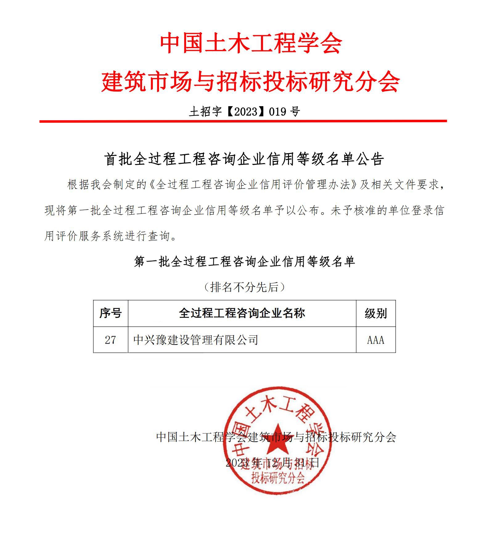 近日,中興豫建設管理有限公司獲評中國土木工程學會建筑市場與招標投標研究分會“首批全過程工程咨詢企業(yè)信用等級評價AAA企業(yè)”,成為河南省內唯一首批獲得該信用評價等級的全過程工程咨詢企業(yè)。