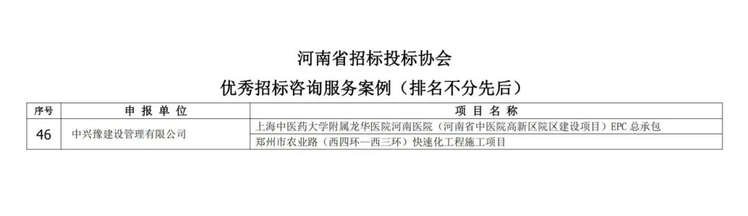 近日,河南省招標投標協(xié)會公布了“關(guān)于優(yōu)秀招標咨詢服務案例并對優(yōu)秀案例申報單位進行表彰的決定”。經(jīng)專家評審,中興豫建設(shè)管理有限公司入選其中,兩項工程被評為優(yōu)秀招標咨詢服務案例。