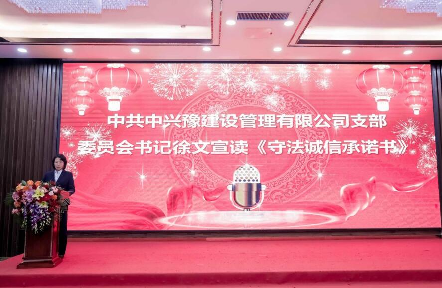 中共中興豫建設(shè)管理有限公司支部委員會(huì)書記徐文宣讀《守法誠信承諾書》,公司總裁、副總裁及各中心總經(jīng)理分別簽訂《守法誠信承諾書》。