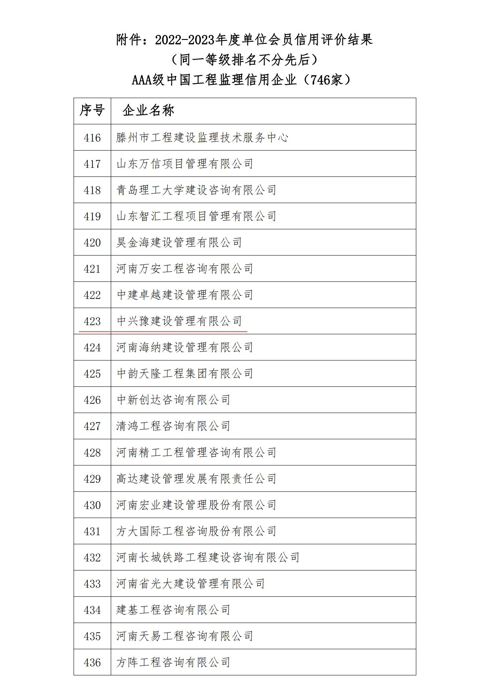 近日,中國建設監(jiān)理協(xié)會發(fā)布了《關于2022-2023年度中國建設監(jiān)理協(xié)會單位會員信用評價結果的公示》,經自評、省級協(xié)會初評、專家評委綜合評審、公示、反饋、專家復核等評價程序,中興豫建設管理有限公司榮獲中國工程監(jiān)理信用評價AAA級企業(yè)!