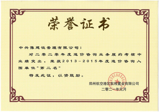 近日,經(jīng)鄭州航空港區(qū)航程置業(yè)有限公司對2013-2015年度、2015-2017年度、2018-2019年度造價咨詢?nèi)雵鷨挝坏穆募s情況進行嚴格、公平、公正的考評,中興豫建設(shè)管理有限公司業(yè)績突出,榮獲2013-2015年度造價咨詢?nèi)雵鷨挝弧暗诙?,并授予榮譽證書。