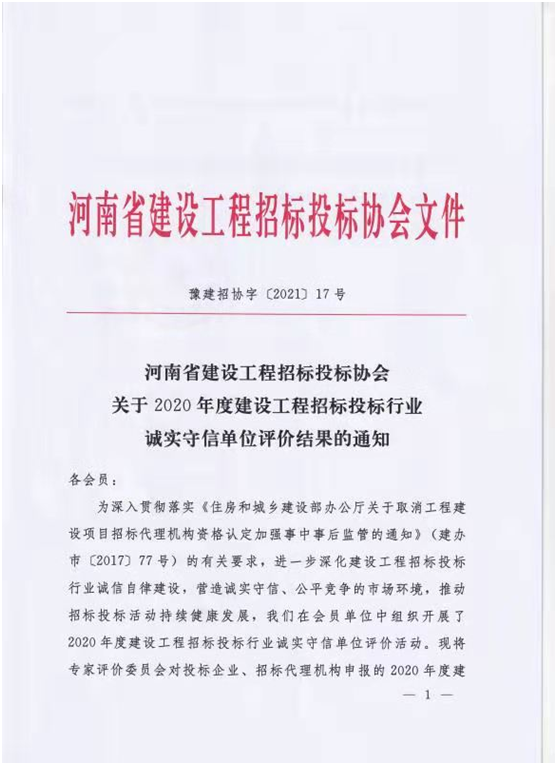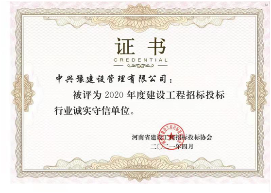 為推動(dòng)招標(biāo)投標(biāo)活動(dòng)持續(xù)健康發(fā)展,河南省建設(shè)工程招標(biāo)投標(biāo)協(xié)會(huì)在會(huì)員單位中組織開展了2020年度建設(shè)工程招標(biāo)投標(biāo)行業(yè)誠實(shí)守信單位評(píng)價(jià)活動(dòng)。日前,經(jīng)專家評(píng)選,中興豫建設(shè)管理有限公司被評(píng)為“2020年度建設(shè)工程招標(biāo)投標(biāo)行業(yè)誠實(shí)守信單位”,并授予獲獎(jiǎng)證書。