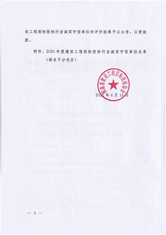 “2020年度建設(shè)工程招標(biāo)投標(biāo)行業(yè)誠實(shí)守信單位”