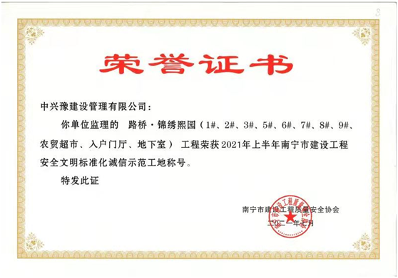 由中興豫建設管理有限公司監(jiān)理的路橋·錦繡熙園、路橋錦繡銘城項目在施工階段被評為“2021年上半年南寧市建設工程安全文明標準化誠信示范工地”。